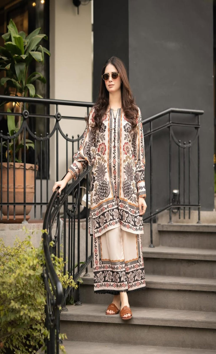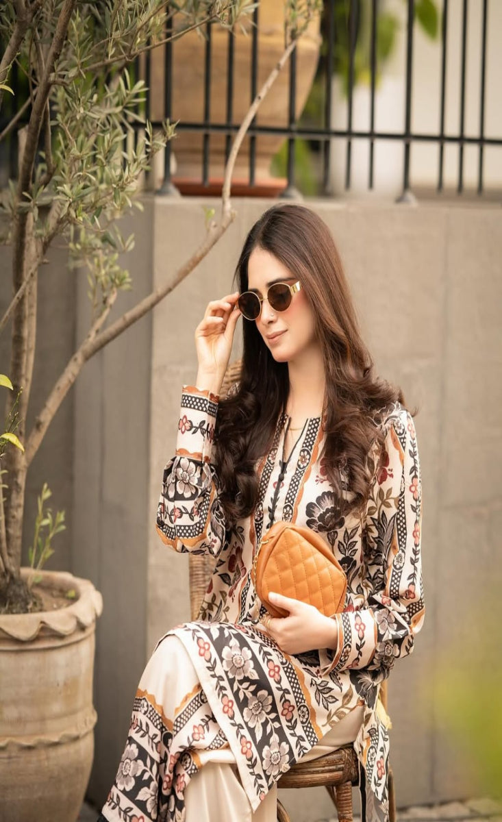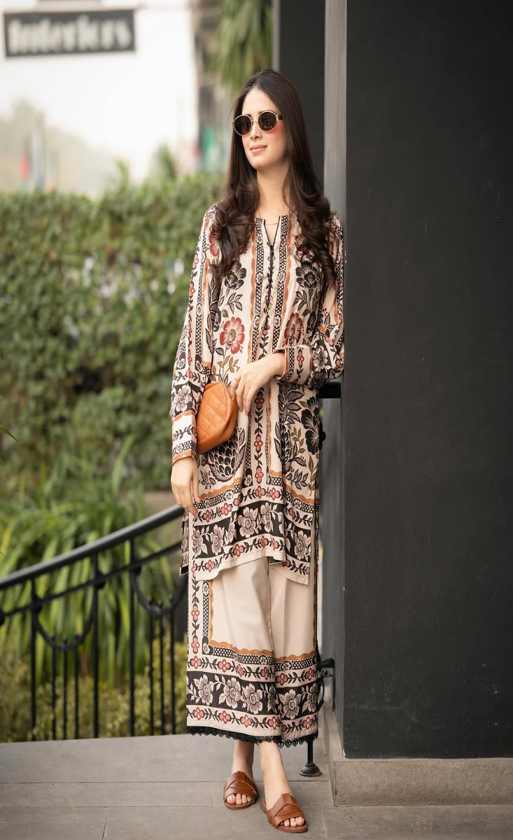 Crafted from premium blended lawn, this lightweight and breathable outfit offers all-day comfort while maintaining a polished, graceful look. The shirt features an elegant beige base adorned with rich floral and ethnic border prints in deep brown and rust hues, creating a timeless aesthetic that blends tradition with modern styling.